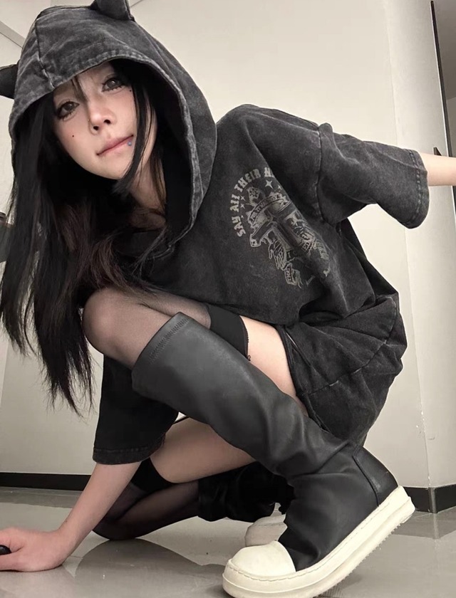 2406207 フード付きTシャツ 半袖パーカー ダメージ加工 ユニセックス プルオーバー レディースファッション 角付きフード 春夏コーデ ブラック ホワイト M L XL