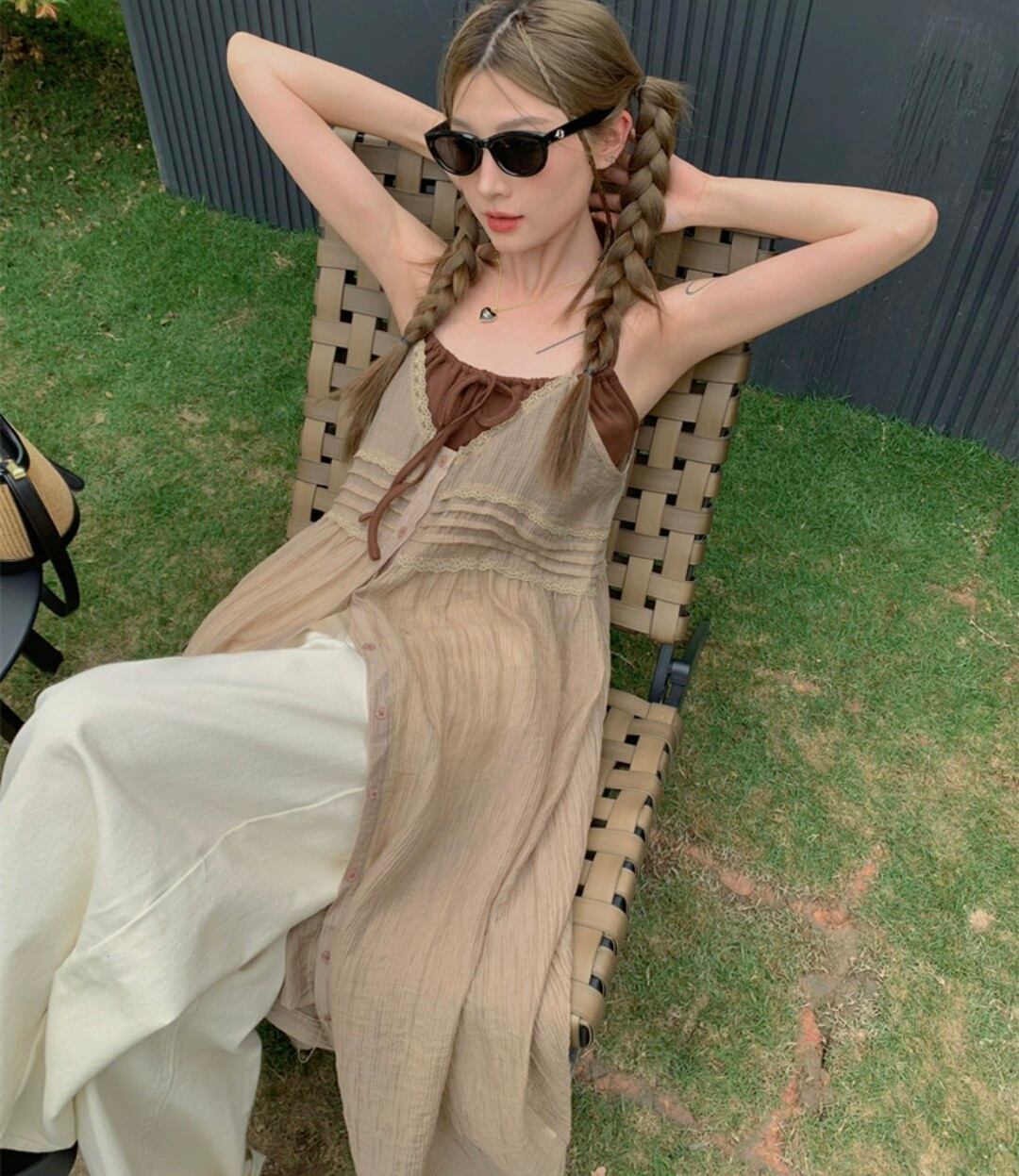 2405202 キャミワンピース ノースリーブ シアー シフォン ロング丈 レイヤード 大人かわいい レース 重ね着 レディースファッション ホワイト カーキ フリーサイズ