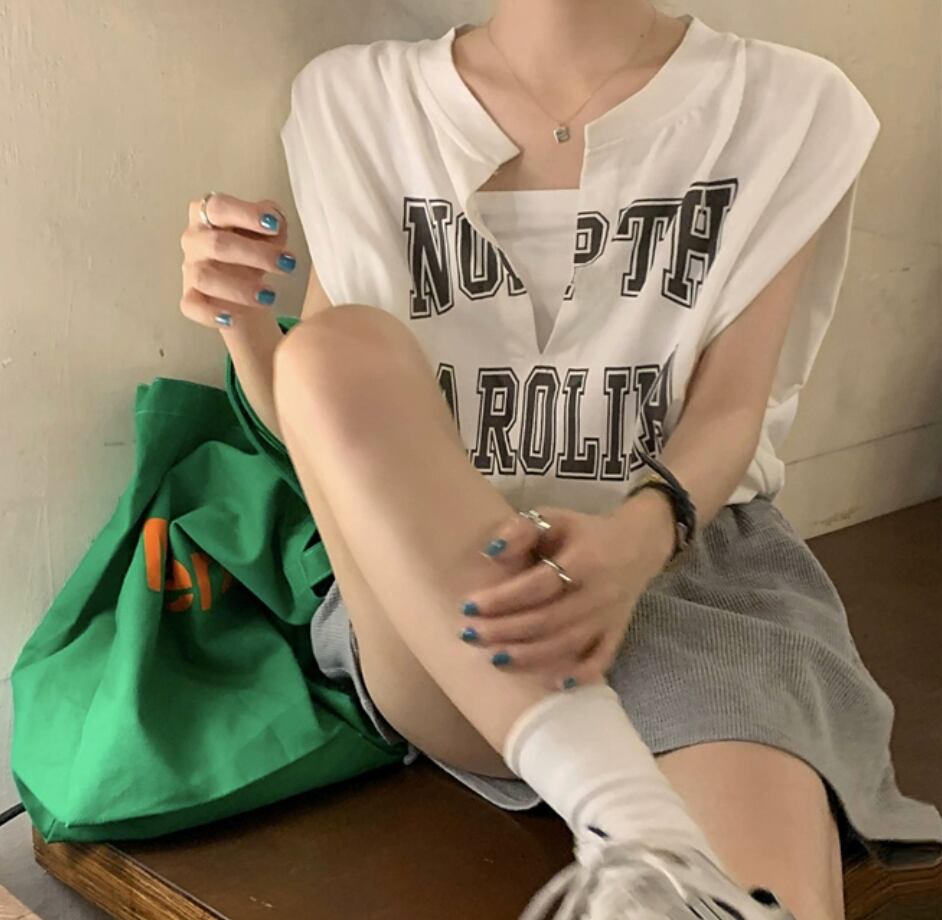 2405222 Tシャツ ノースリーブ キーネック 英字 ショート丈 春夏コーデ レディースファッション M L グレー ホワイト