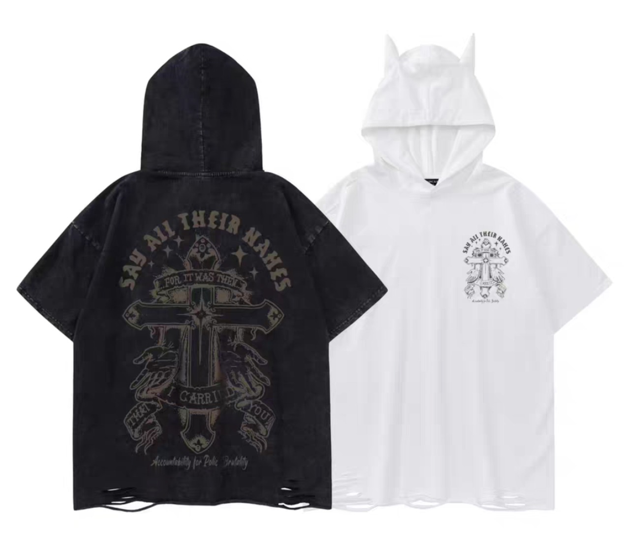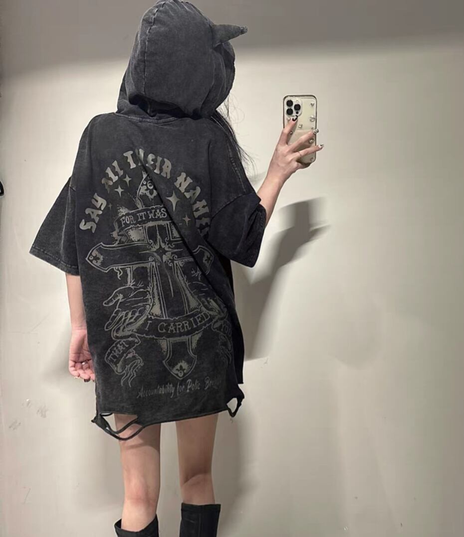 2406207 フード付きTシャツ 半袖パーカー ダメージ加工 ユニセックス プルオーバー レディースファッション 角付きフード 春夏コーデ ブラック ホワイト M L XL